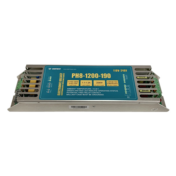 | PH8-1200-190 | 1,87A@110V 0,85A@240V | 206 | 250*65*40 | 1,0-1,2 | 42-190 | 1 * lâmpada: GPHA1000T5 GPHA1554T5 2 * lâmpada: GPHA843T5 GPHA357T5 |